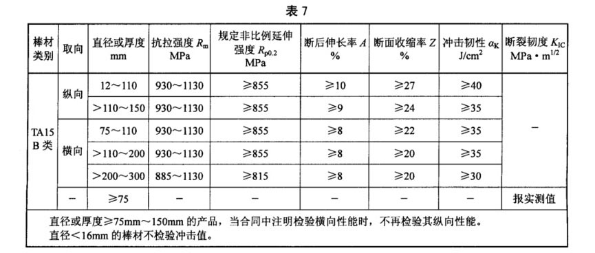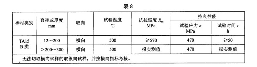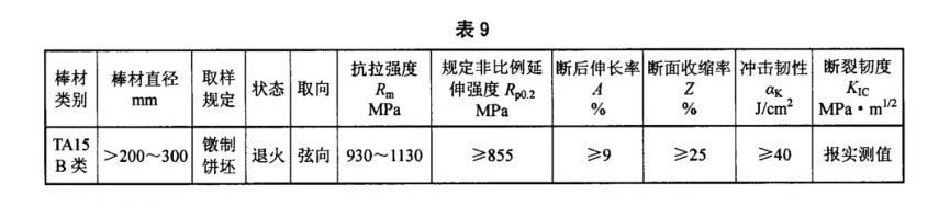 3.4.4 B類用途的TA15鈦合金棒材,其室溫力學性能在退火態棒材上或經熱處理后的棒坯(一段棒材)上取樣測試。其室溫力學性能應符合表7的規定,高溫力學性能應符合表8的規定;當訂購方要求并在合同中注明時,直徑大于200mm的棒材應取樣鐓制餅坯,餅坯的室溫力學性能應符合表9的規定。