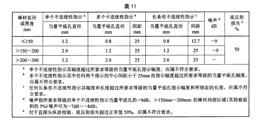 3.6.2 B類用途的TA15鈦合金棒材,應按本規范的附錄A進行徑向縱波、周向橫波檢驗。徑向縱波檢驗允許的缺陷當量值見表11,周向橫波檢驗不允許存在任何超過人工傷反射幅度的信號。